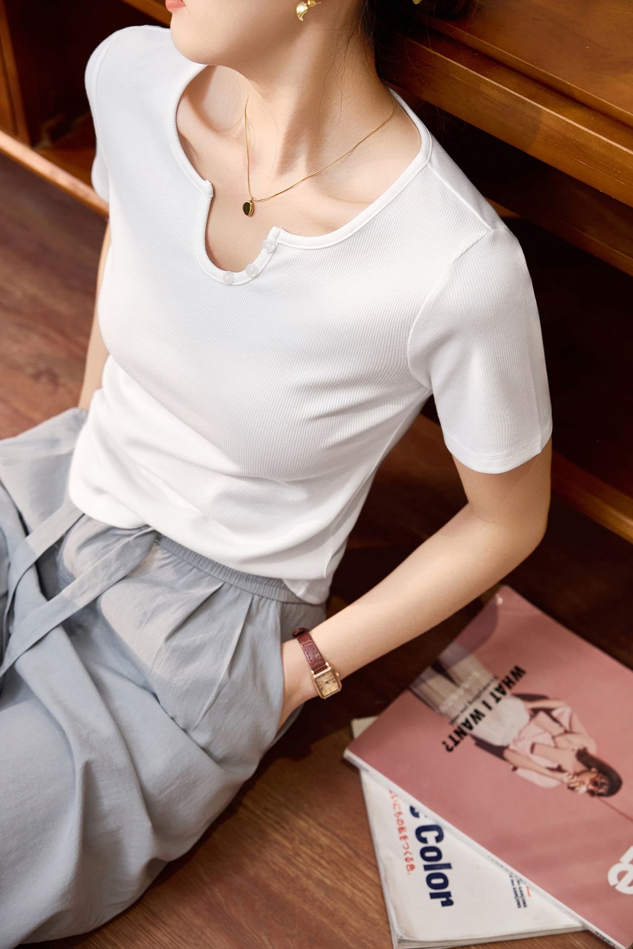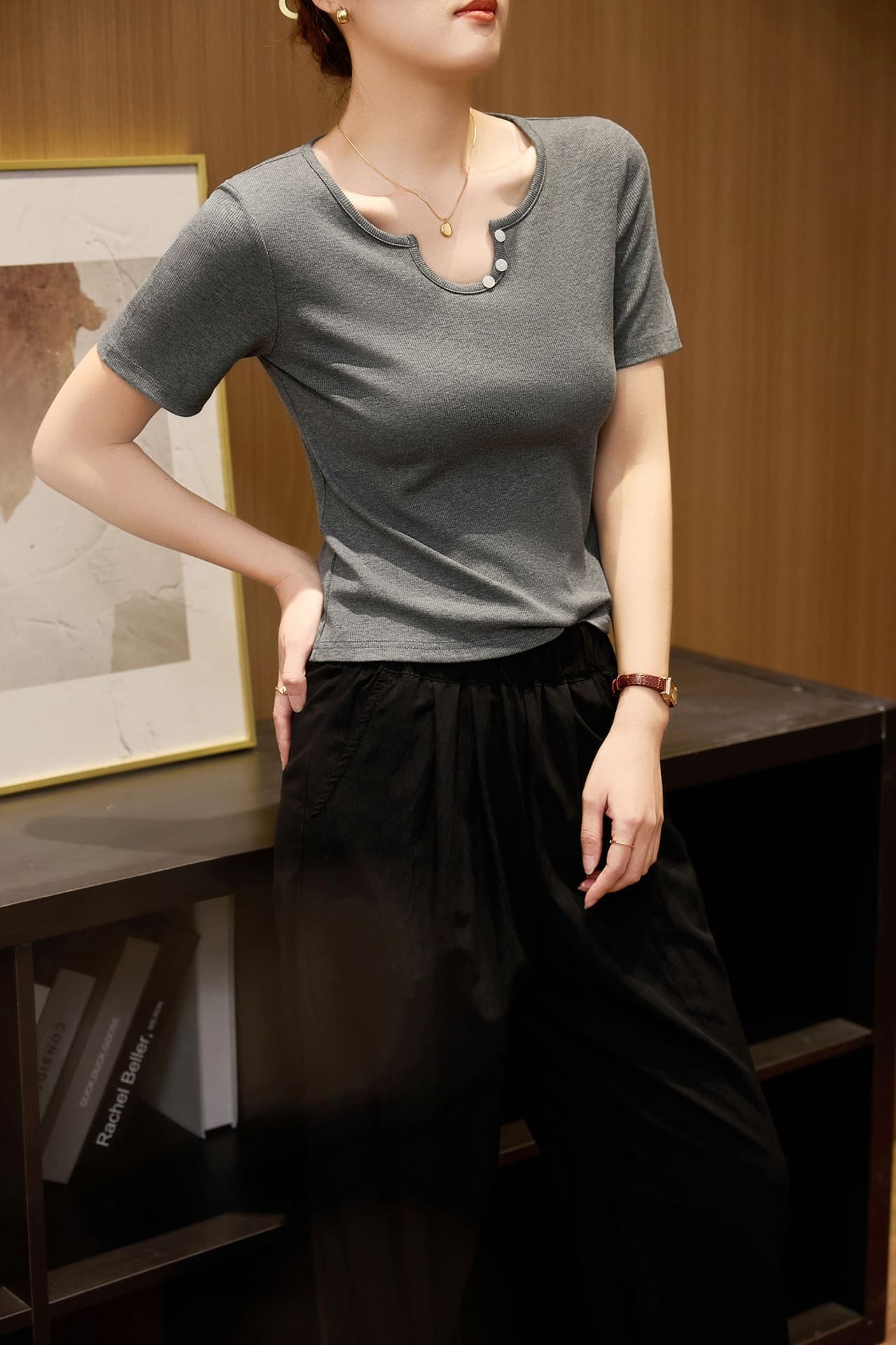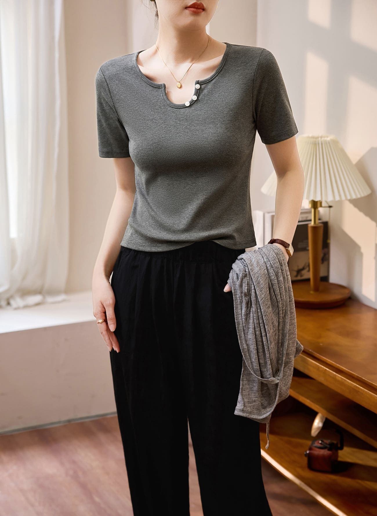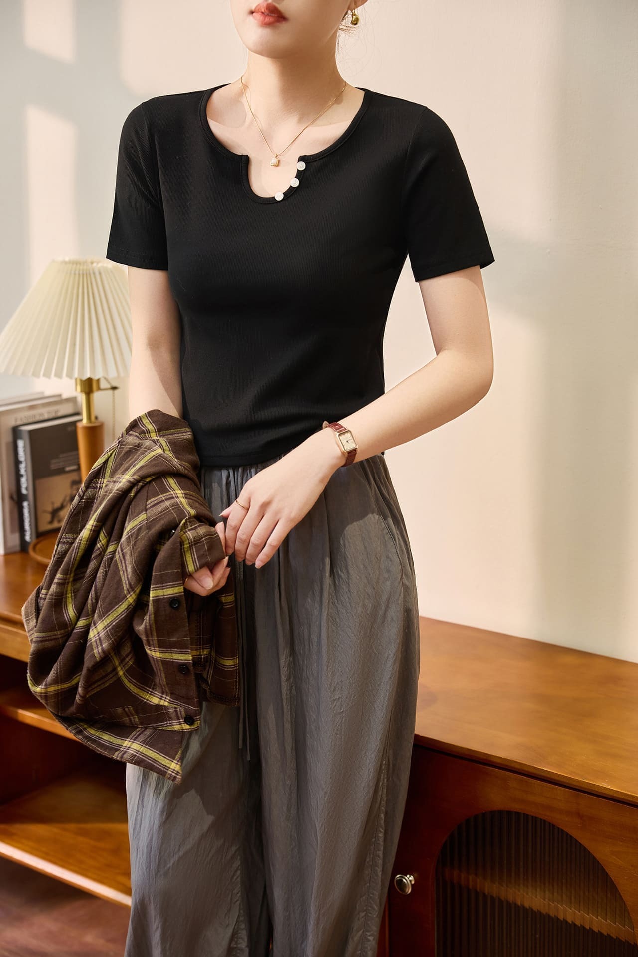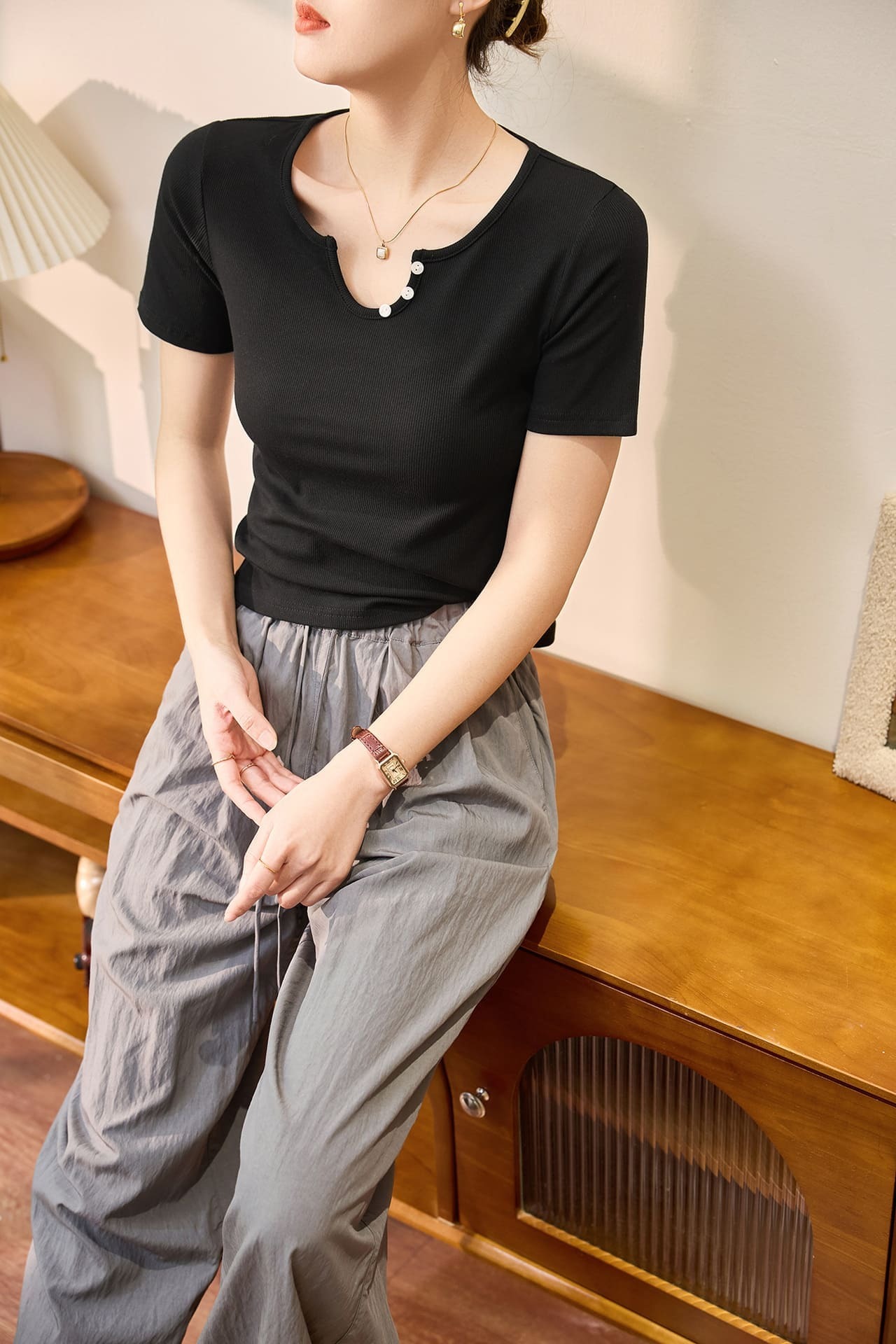 ● U領設計:獨特的U型領口,搭配貝殼扣,增添精緻感。
