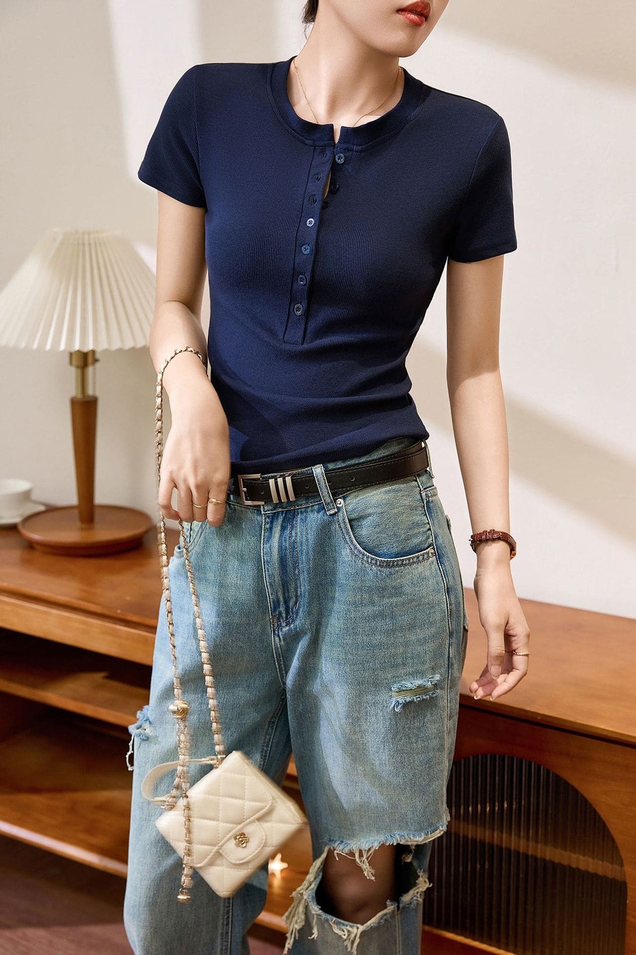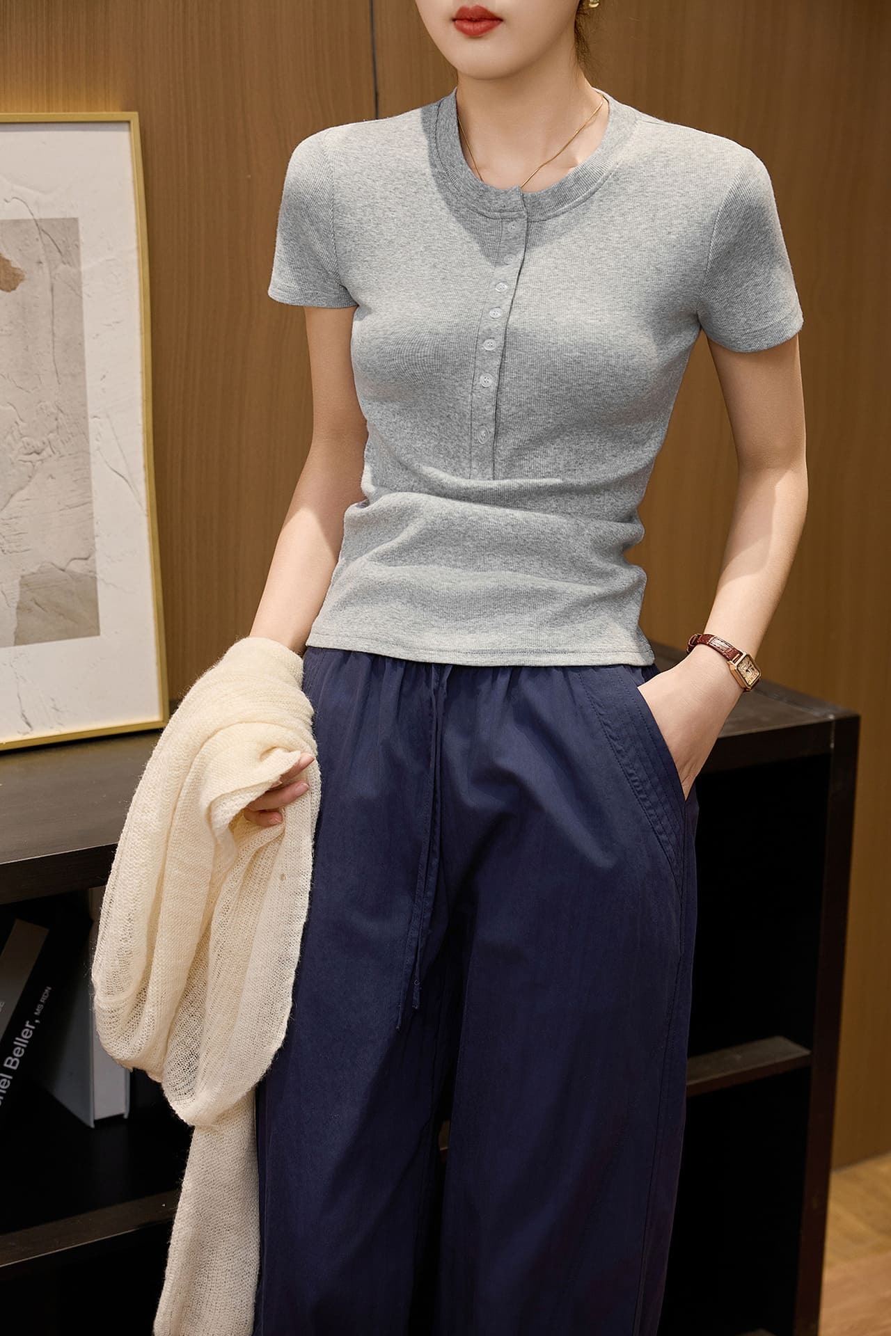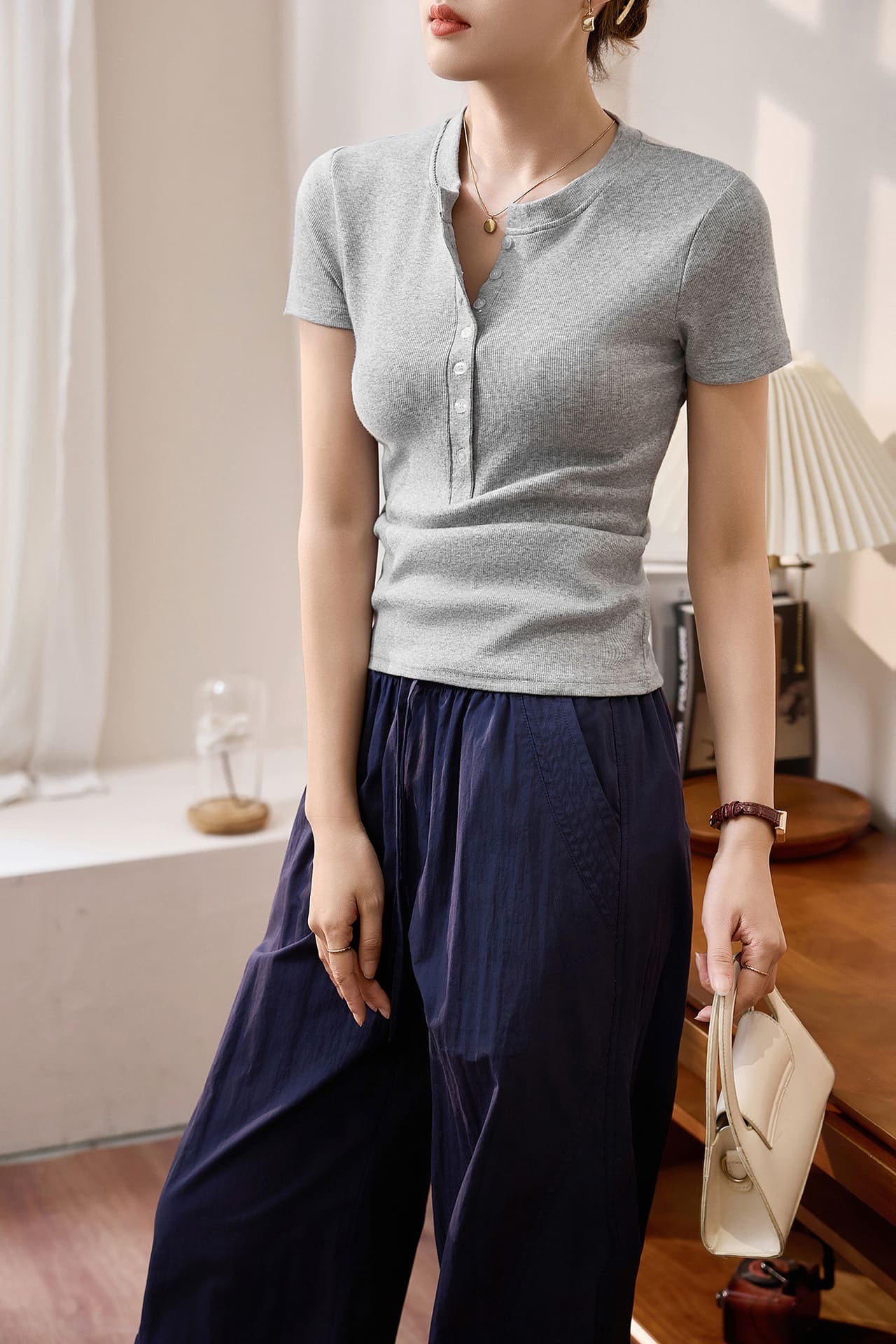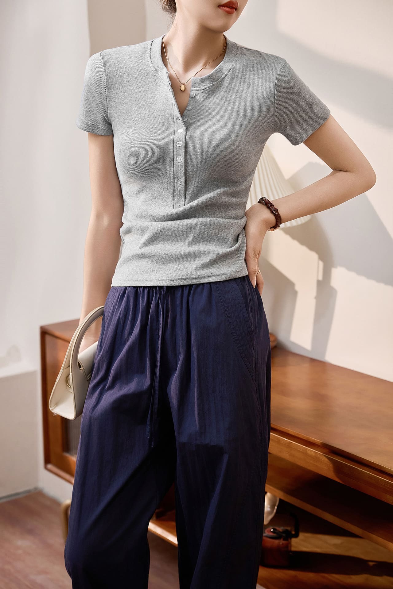 ● 亨利領設計:經典亨利領搭配簡約鈕扣,增添優雅氣質。